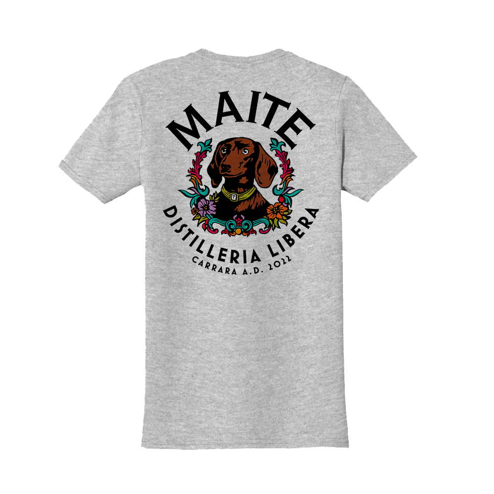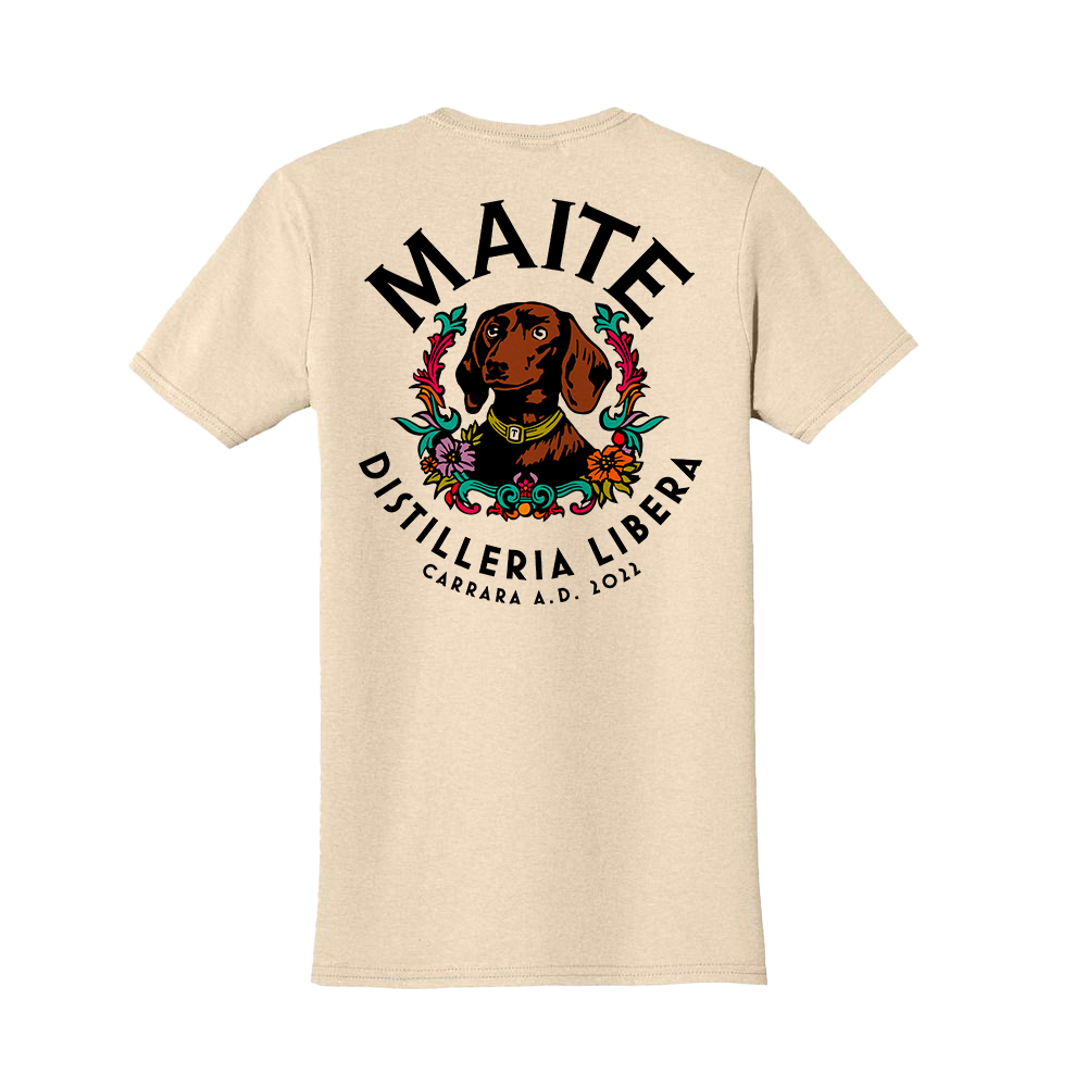 T-shirt Maite con scritta "ce la faremo anche sta vodka" e logo sul retro della maglietta.